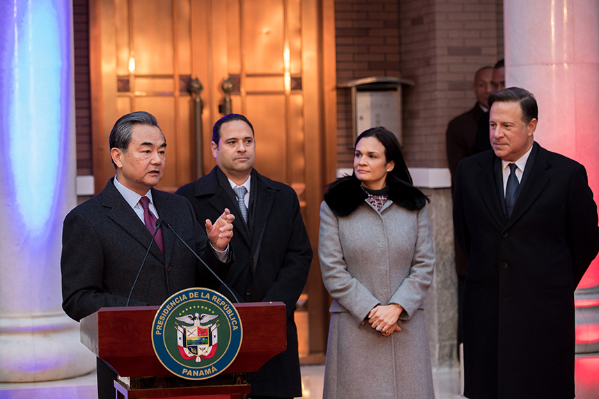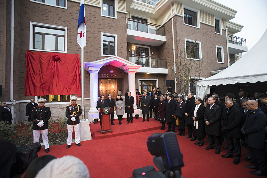 11月16日下午,巴拿馬共和國(guó)駐華使館開館儀式在北京舉行,巴拿馬總統(tǒng)巴雷拉、中國(guó)外交部長(zhǎng)王毅共同出席開館儀式。巴雷拉總統(tǒng)衛(wèi)隊(duì)升起巴拿馬國(guó)旗,中國(guó)軍樂隊(duì)分別演奏中、巴兩國(guó)國(guó)歌,巴拿馬國(guó)旗第一次在中國(guó)的心臟首都北京上空飄揚(yáng)。
