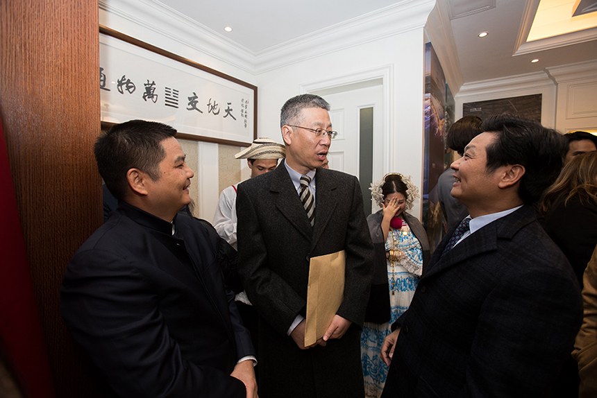 ▲巴拿馬駐華大使施可方(左二)、中國(guó)駐巴拿馬大使魏強(qiáng)(左三)與古少明主席(左一)、古樸副總裁(右二)在“天地交 萬物通”書畫作品前合影留念,期待中巴友誼與經(jīng)貿(mào)合作前景無限