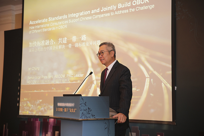 ▲香港AECOM副總裁鐘小平作《加快標準融合 共建一帶一路》主題分享