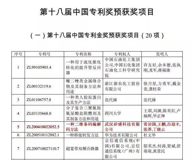 近日,從中國專利獎評審辦公室獲悉,武漢矽感科技有限公司的發(fā)明專利“一種二維條碼編解碼方法”喜獲第十八屆中國專利金獎。
