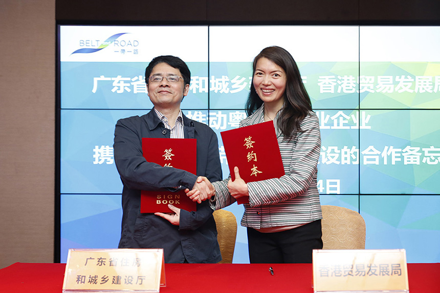 ▲廣東省住房和城鄉(xiāng)建設(shè)廳黨組成員、副廳長蔡瀛與香港貿(mào)易發(fā)展局華南首席代表吳文慧作為粵港雙方代表簽署《推動粵港建筑業(yè)企業(yè)攜手參與“一帶一路”建設(shè)的合作備忘錄》