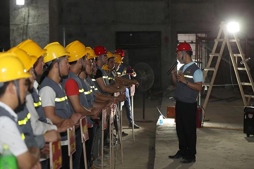 珠海橫琴星藝文創(chuàng)天地項目工序多、工程量大,存在著多工種、多工序的交叉作業(yè),對施工形成極大的考驗。早在項目招標時,甲方就對工程進度和質(zhì)量提出了嚴格要求:施工單位必須嚴格遵守甲方提出的各項質(zhì)量標準,且必須在八月初保質(zhì)保量完成。針對這一現(xiàn)實情況,寶鷹集團立即組建保質(zhì)量、保工期工作小組,積極部署項目建設,并召開此次安全培訓暨百日攻堅誓師大會,以保障項目如期高質(zhì)量完工。