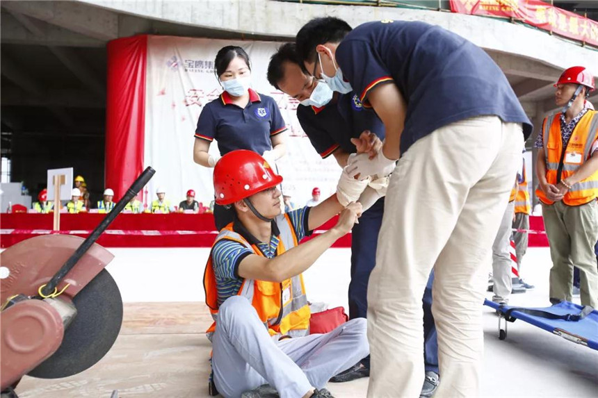 演習(xí)項(xiàng)目分為機(jī)械傷害演練、觸電傷害演練、高處墜落演練和消防疏散演練。來(lái)自寶鷹集團(tuán)質(zhì)安管理部、幕墻事業(yè)部和柔宇項(xiàng)目部的九十余名員工,分為安全通訊、疏散警戒、搶險(xiǎn)救援、醫(yī)療救護(hù)等多組集結(jié)成隊(duì),井然有序地參與演習(xí)。
