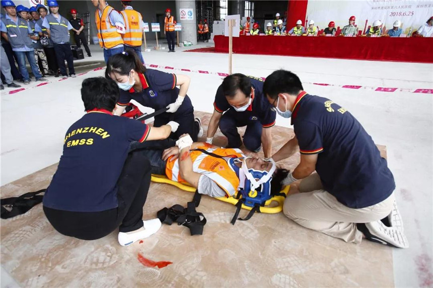 高處墜落事故模擬場(chǎng)景中,一名工人因違規(guī)使用防護(hù)用品,不慎從高處墜落,發(fā)現(xiàn)情況的同事立即呼救,各組迅速出動(dòng),進(jìn)行救援。120醫(yī)護(hù)人員及時(shí)趕到現(xiàn)場(chǎng),順利完成救治。同時(shí),醫(yī)護(hù)人員還講解和示范了身體檢查和包扎標(biāo)準(zhǔn)流程。