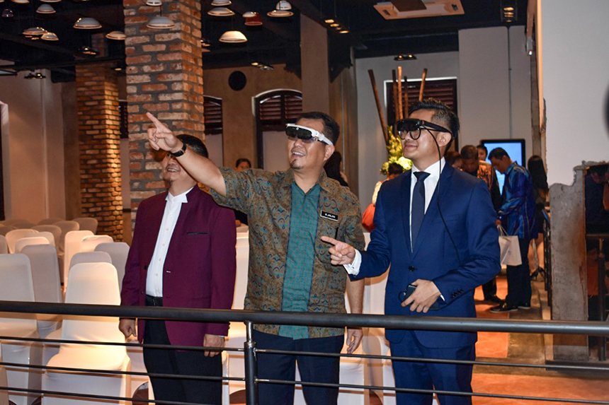 ▲馬六甲旅游、文化及遺產(chǎn)委員會(huì)主席莫哈末再拉尼(左二)與寶鷹集團(tuán)副總裁古樸(左一)、太平洋未來科技CEO 李建億(右一)體驗(yàn)AM Glass