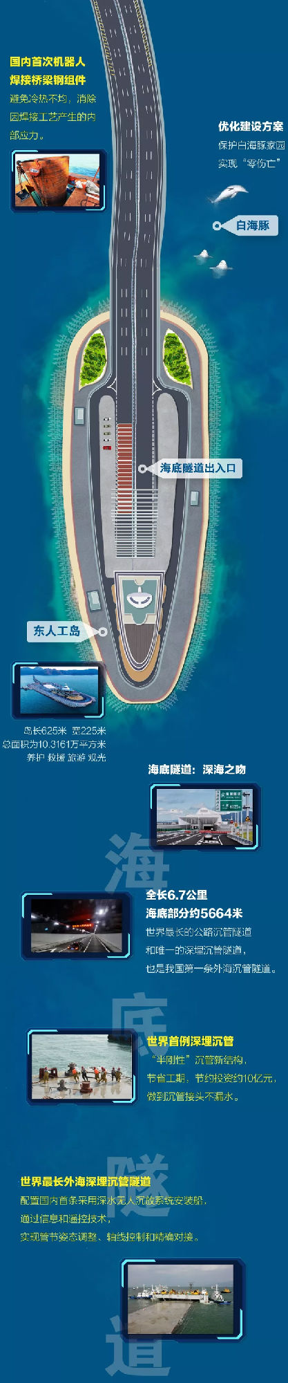 港珠澳大橋跨越伶仃洋,東接香港,西接廣東珠海和澳門,總長約55公里,其中主體工程“海中橋隧”長35.578公里,海底隧道長約6.75公里。歷經(jīng)5年規(guī)劃、9年建設(shè),工程項(xiàng)目總投資額1269億元,是粵港澳三地首次合作共建的超大型跨海交通工程。