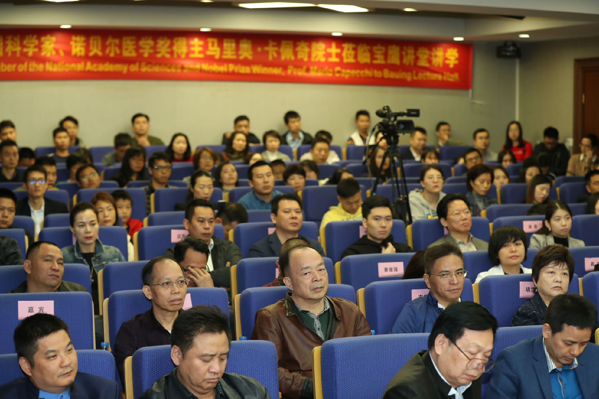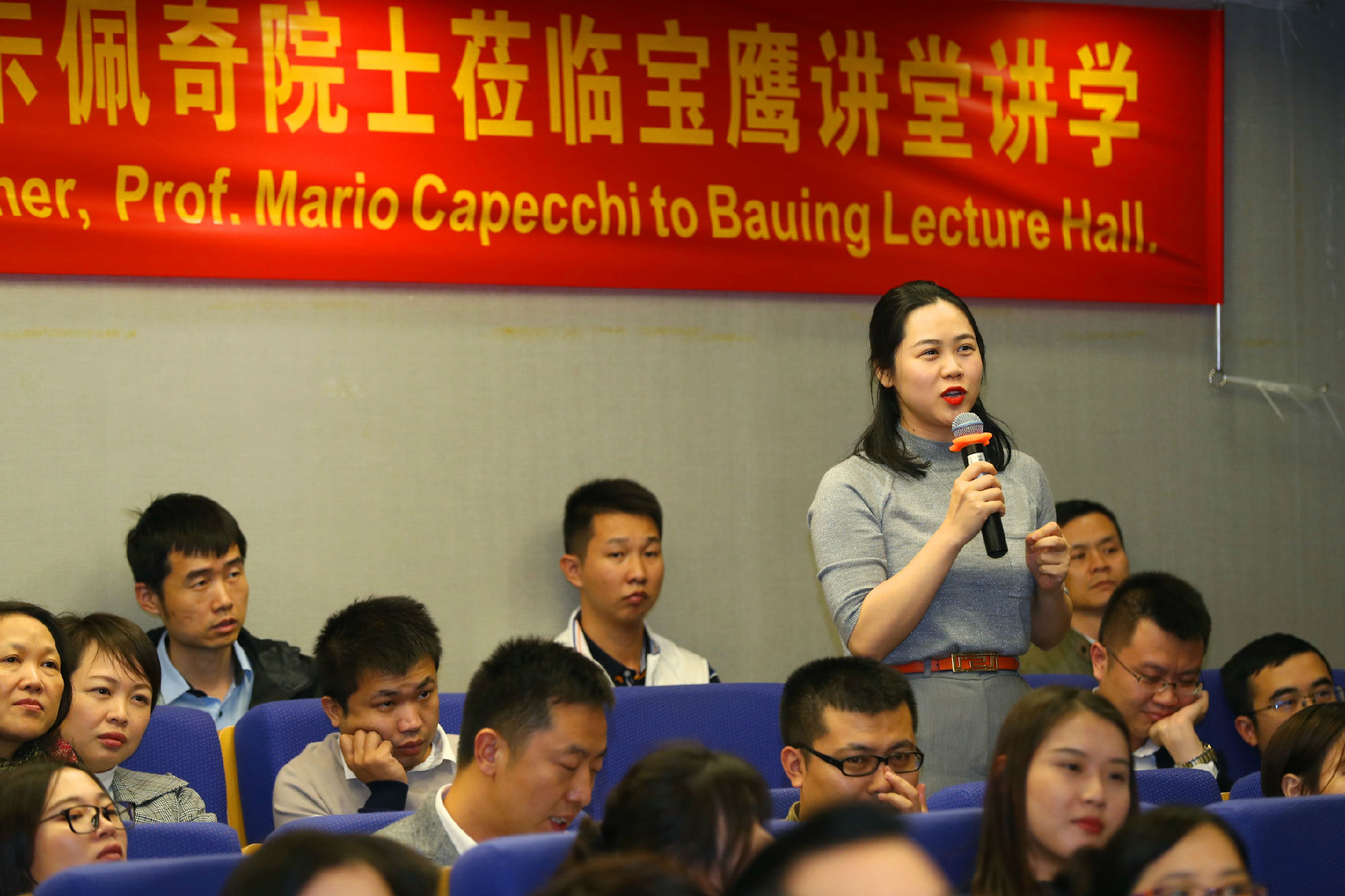 馬里奧·卡佩奇院士博士生、中國農(nóng)業(yè)大學(xué)吳森教授隨行并實時傳譯??ㄅ迤嬖菏康木史窒硪鹆嗽谧襟w及聽眾的熱烈探討。
