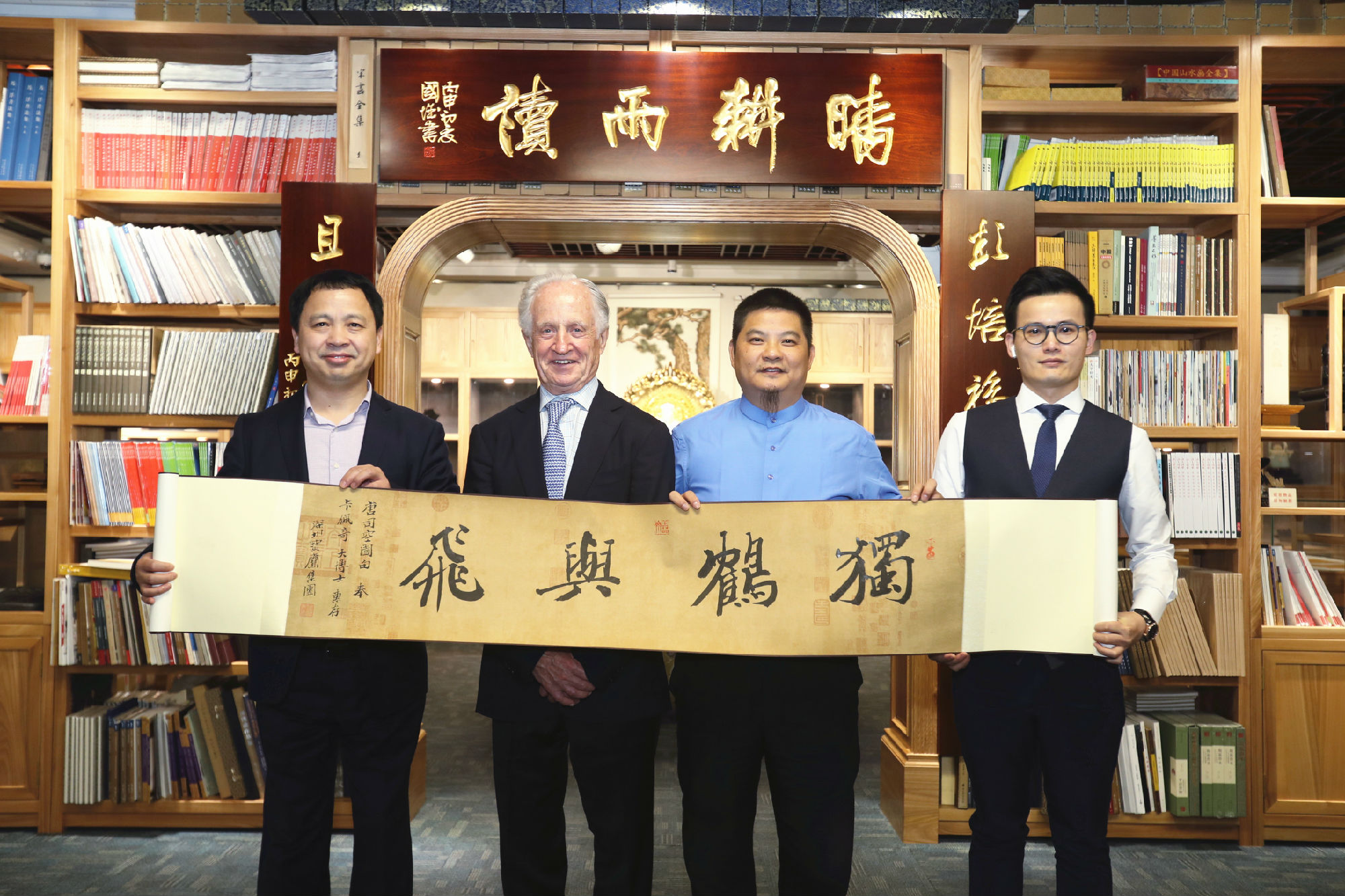 ▲寶鷹集團副總裁古樸向卡佩奇院士贈送西泠印社社員、寶鷹美術(shù)館館長王躍慶書法作品《獨鶴與飛》