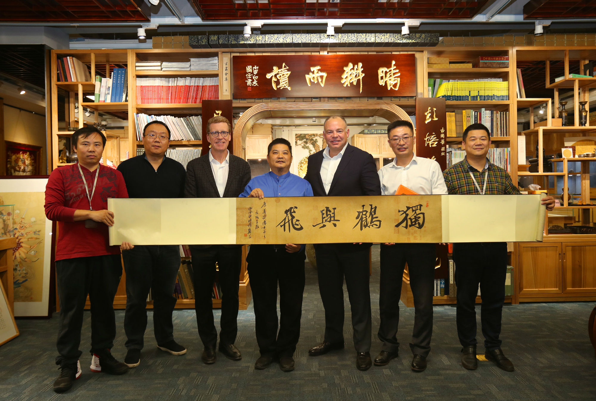 ▲古樸常務(wù)副總裁向唐義恩博士贈送寶鷹美術(shù)館館長王躍慶書法作品“獨(dú)鶴與飛”