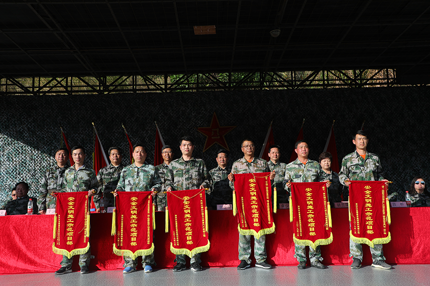 ▲深圳裝飾協(xié)會會長高剛,寶鷹集團(tuán)董事局主席古少明,寶鷹股份董事長古少波為“安全文明施工示范項目部”頒獎