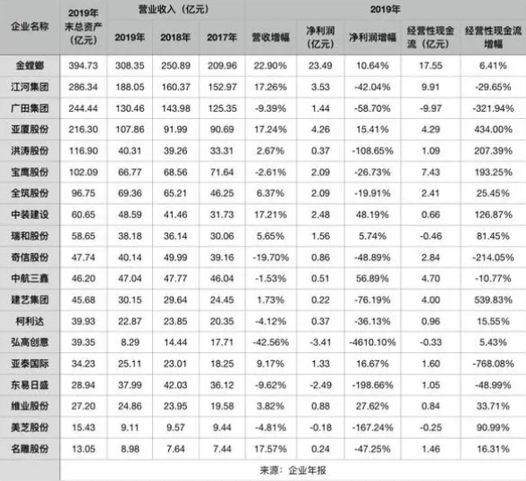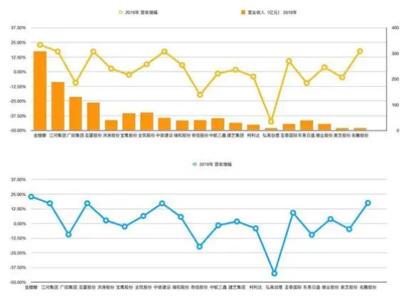 近日,隨著最后一家A股建筑裝飾企業(yè)洪濤股份的年報(bào)浮出水面,A股建筑裝飾企業(yè)2019年年報(bào)全部公布完畢,業(yè)績?cè)鏊僬w放緩、行業(yè)集中度不斷提升的發(fā)展態(tài)勢(shì)一目了然。在本研究報(bào)告統(tǒng)計(jì)的19家典型樣本A股建筑裝飾企業(yè)中,有的深耕主業(yè),在2019年實(shí)現(xiàn)業(yè)績平穩(wěn)增長,有的則出現(xiàn)業(yè)績大幅下滑,甚至出現(xiàn)大額虧損。其中,弘高創(chuàng)意虧損3.41億元,同比下降4610.10%。營收和歸屬于上市公司股東凈利潤(以下簡稱“凈利潤”)雙增長的只有6家,分別為金螳螂、亞廈股份、中裝建設(shè)、瑞和股份、亞泰國際、維業(yè)股份。