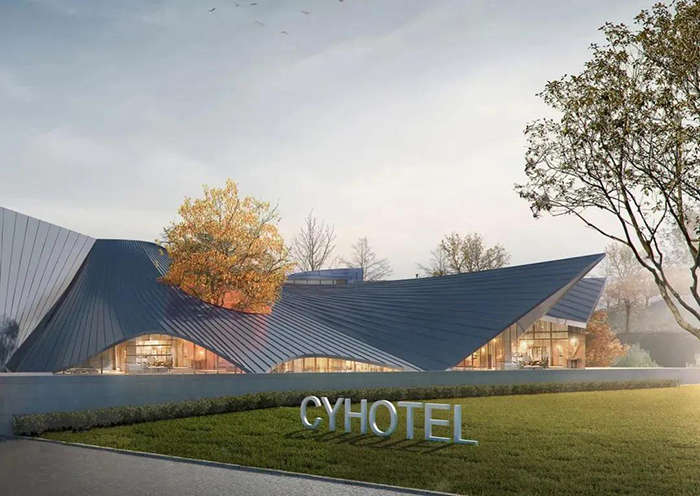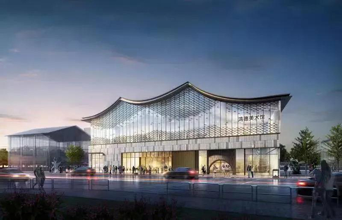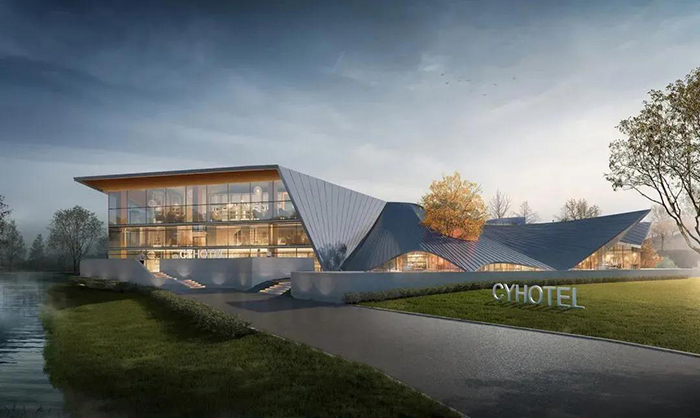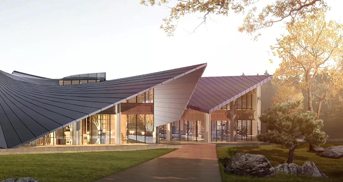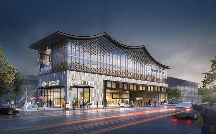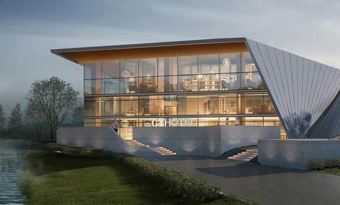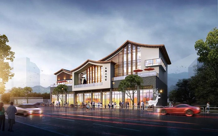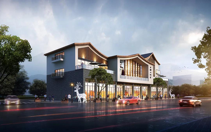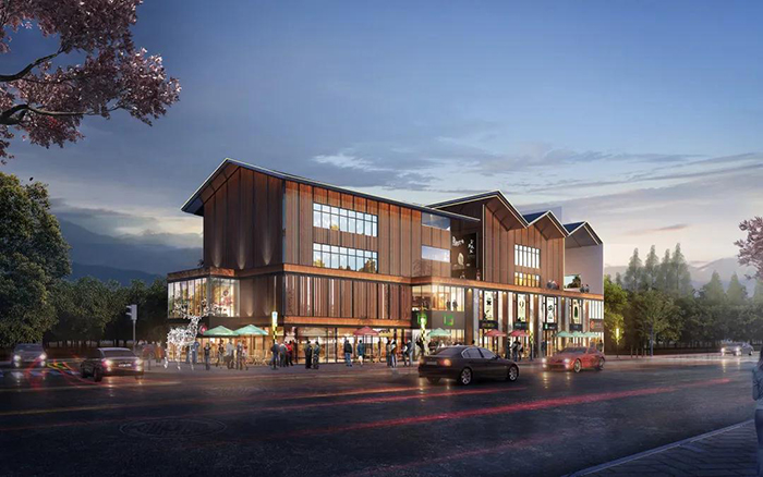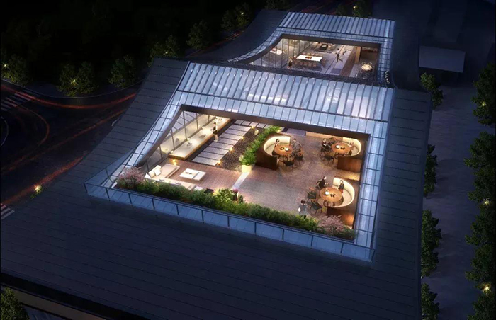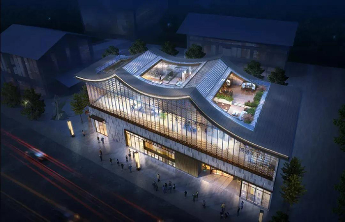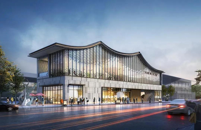 建筑整體采用玻璃幕墻+千紙鶴構件、格柵結合仿石材紋理PU磚、實墻和落地玻璃櫥窗,形成從虛到實的變化關系,使得層疊層次更為豐富。人字坡檐在結合立面和地形向南北延伸,整體比例更加穩(wěn)重大氣。