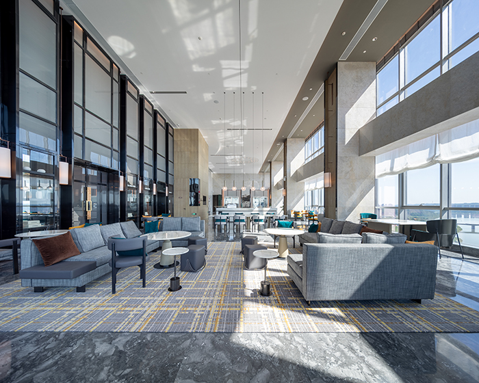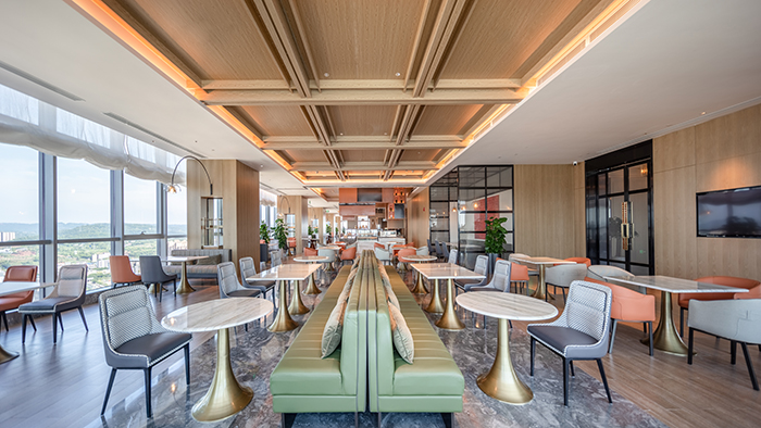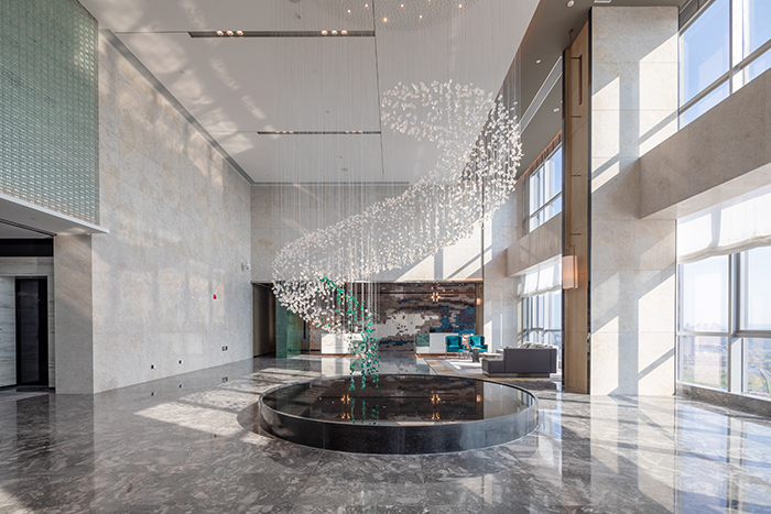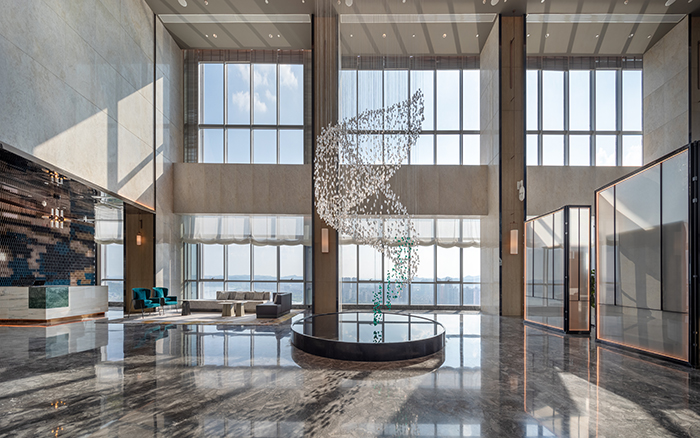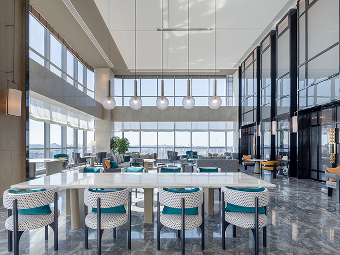 酒店的設(shè)計(jì)從南充歷史悠久的古鎮(zhèn)老街、絲綢文化汲取創(chuàng)意,將歷史文化與現(xiàn)代建筑完美結(jié)合。大堂以簡約大方的造型表達(dá),整個(gè)空間色彩明快、柔和,既現(xiàn)代簡約,又時(shí)尚活潑,從視覺上凝聚顏色,從空間上體現(xiàn)美感。110米高空的超大雙層落地窗,可俯瞰南充市全景,展現(xiàn)人們對自由生活享受的向往。