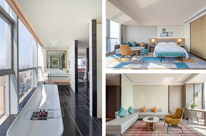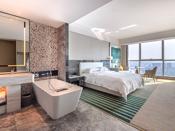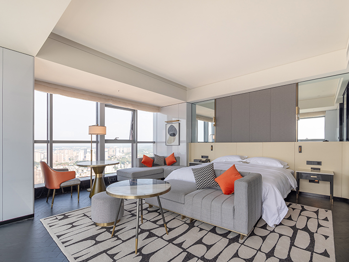 276間寬敞舒適客房,整體風(fēng)格以現(xiàn)代輕奢為主。純粹率性的豎條打底墻面搭配精致燈具,淺白色的整體屋面配合墨綠和橘紅,讓人沉浸在整潔舒適、愉悅自在的氛圍之中。窗外,嘉陵江水波光粼粼,兩岸高低錯(cuò)落的建筑和生態(tài)景觀盡收眼底,星級酒店氣質(zhì)盡現(xiàn)。