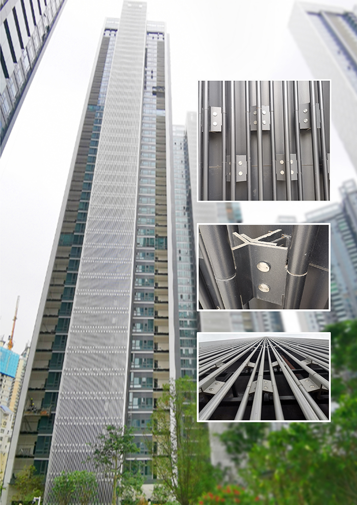 為了解決扁管形、方管形等傳統(tǒng)格柵幕墻施工的安裝技術難題,寶鷹集團通過項目施工安裝實踐,積累豐富的實踐經(jīng)驗,取得了“圓管格柵幕墻施工技術”的研究成果。圓管格柵幕墻施工技術是在鋁板幕墻系統(tǒng)的基礎上外加圓管格柵系統(tǒng)組成的一種幕墻形式。該技術已在多個項目成功運用,并取得了較好的社會效益和經(jīng)濟效益。