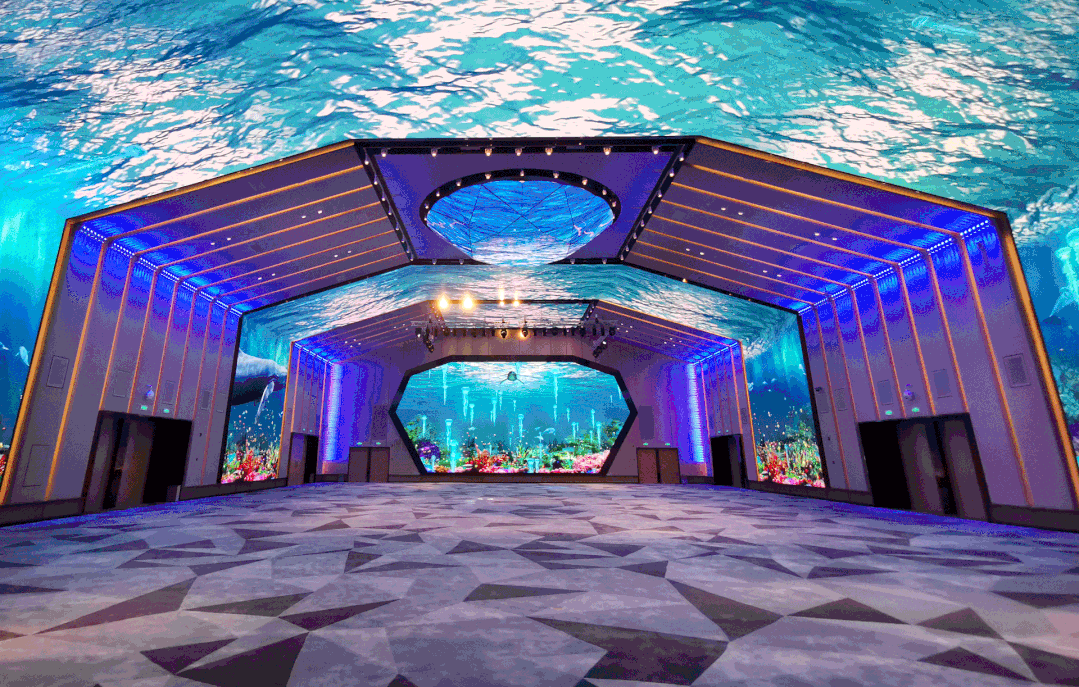 其中,寶鷹負(fù)責(zé)裝飾的商業(yè)宴會(huì)廳,采用全景沉浸式的無柱設(shè)計(jì),結(jié)合1400平米超大空間、恢弘的動(dòng)態(tài)裸眼3D畫面、立體環(huán)幕影像展示將實(shí)景與聲線、光影相融一體,呈現(xiàn)出身臨其境的極致感觀體驗(yàn)。