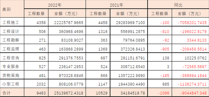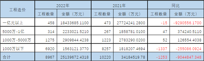 2022年重大項(xiàng)目逐步啟動(dòng),超1億元中標(biāo)金額的工程項(xiàng)目對比2021年度小幅降低,但總投資金額下降明顯,這對以承接大工程為主的施工企業(yè)來說,整個(gè)市場大項(xiàng)目投資金額降低,經(jīng)營空間進(jìn)一步壓縮。這對工程設(shè)計(jì)、勘察等方面也會(huì)造成影響。