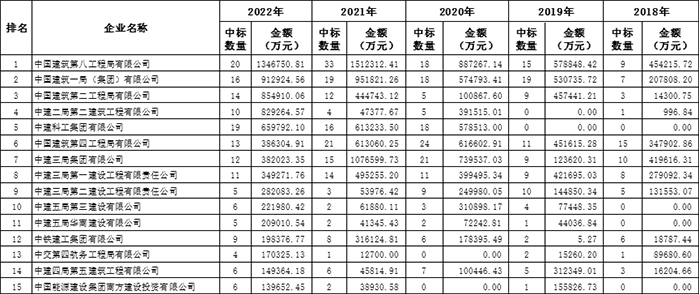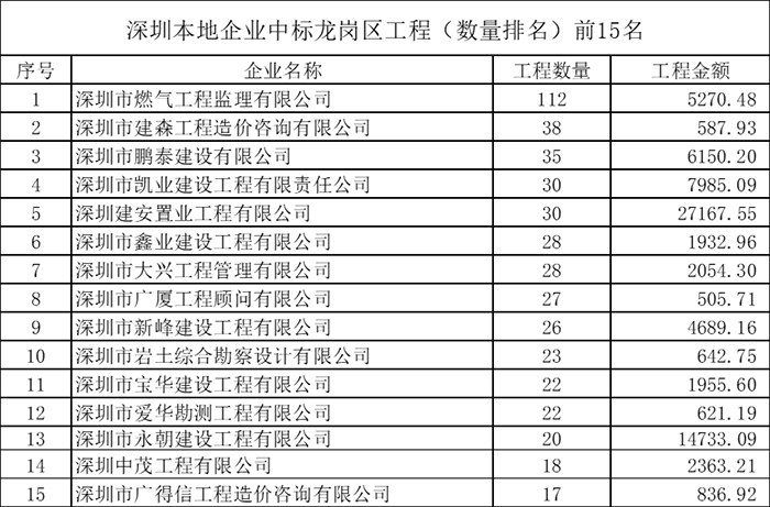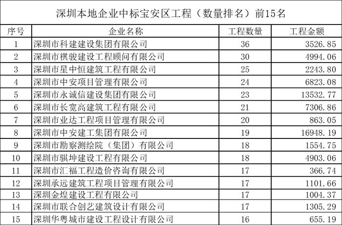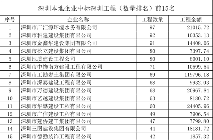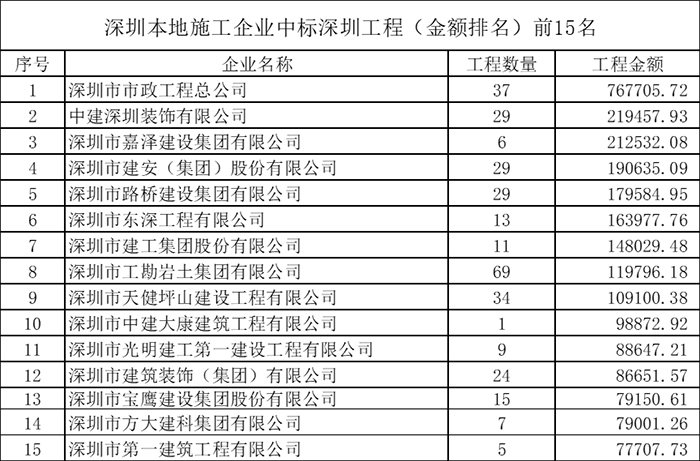 2、深圳本地建筑施工企業(yè)2022年在深圳市建筑業(yè)市場中標(biāo)排名前15名,按中標(biāo)金額排名如下: