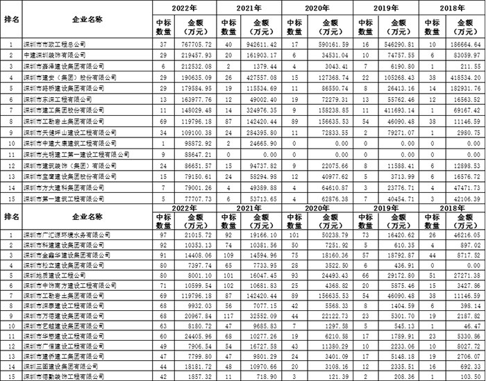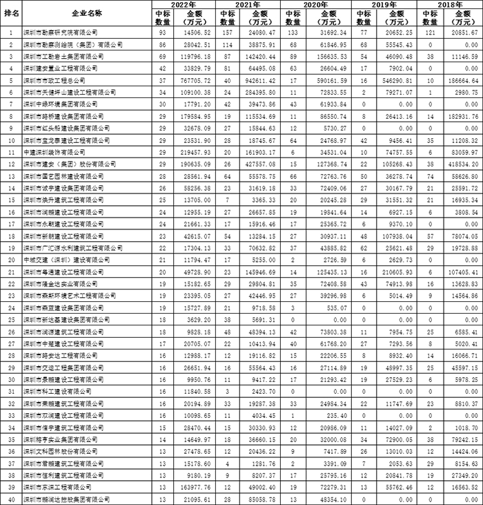 2021-2022年深圳市建筑企業(yè)“市政公用工程施工總承包一級和建筑工程施工總承包一級”企業(yè)在深中標(biāo)數(shù)量排名前40名單位如下: