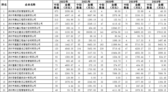 近五年在深圳市建筑業(yè)市場活躍的企業(yè)中標(biāo)情況分析如下: