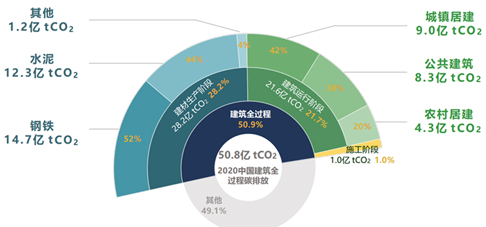 但是,中國(guó)建筑碳排放的總量龐大,建筑碳排放涉及建材生產(chǎn)、施工和建筑運(yùn)行三個(gè)重要階段。根據(jù)《2022年中國(guó)建筑能耗與碳排放研究報(bào)告》,2020年建筑全過(guò)程碳排放總量為50.8億噸二氧化碳,占全國(guó)碳排放的比重為50.9%,建筑行業(yè)實(shí)施碳達(dá)峰碳中和迫在眉睫。