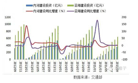 2015年前三季度水運建設(shè)完成投資1007.63億元,同比增長3.23%。 其中,內(nèi)河建設(shè)完成投資361.13億元,同比增長0.87%;沿海建設(shè)完成投資646.5億元,同比增長3.69%。