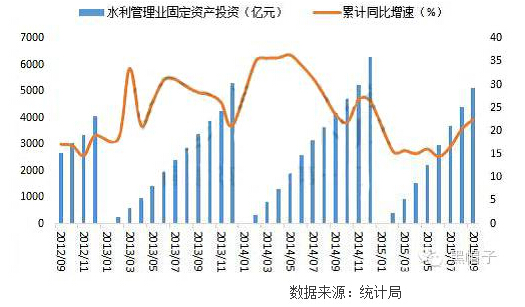 2015年前三季度水利管理業(yè)完成固定資產(chǎn)投資5130億元,同比增長22.5%,增速環(huán)比提高2.1個百分點,較2014年同期下降1個百分點。