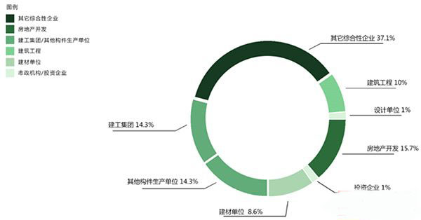 全國各地在推進(jìn)建筑產(chǎn)業(yè)現(xiàn)代化之路上都在不斷的探索實(shí)踐,各地主管部門通過出臺相當(dāng)?shù)墓膭?lì)政策等激勵(lì)舉措,使得無論是在技術(shù)研究還是工程實(shí)施管理方面都積累了很多成功經(jīng)驗(yàn),為我國未來推進(jìn)建筑產(chǎn)業(yè)現(xiàn)代化提供了很好的借鑒。在企業(yè)方面,各地相繼涌現(xiàn)產(chǎn)業(yè)化先行者,據(jù)統(tǒng)計(jì)主要分為以下幾種類型:房地產(chǎn)開發(fā)企業(yè)、國有大型建工集團(tuán)、建筑工程以及建材單位、市政機(jī)構(gòu)、大型綜合性企業(yè)等。通過數(shù)據(jù)分析,大型綜合性企業(yè)尤為關(guān)注產(chǎn)業(yè)化的整體實(shí)踐,占總體量的37.1%,其次為房地產(chǎn)開發(fā)企業(yè),占比15.7%,其間各地許多民營企業(yè)也積極加入了建筑產(chǎn)業(yè)現(xiàn)代化的實(shí)踐之路。