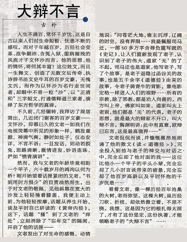 文章《安靜與力量》刊登在 9 月 3 日的《人民日?qǐng)?bào)》副刊,文章《大辯不言》刊登在 9 月 9 日的《渤海早報(bào)》副刊。兩篇文章分別是古樸先生對(duì)文化名人周國(guó)城先生、文懷沙先生及其相關(guān)作品和思想的見解與感受。文章樸實(shí)、自然,文風(fēng)純正,語(yǔ)言簡(jiǎn)潔、明快,主旨明確、暢達(dá),充分闡述了自己對(duì)中國(guó)文化的見解,表達(dá)了對(duì)中國(guó)傳統(tǒng)文化的熱愛以及對(duì)文懷沙、周國(guó)城等文化大師的崇敬。我國(guó)著名的國(guó)學(xué)大師文懷沙老先生讀完文章后親筆評(píng)價(jià)到“陶令欲辯忘言,古樸每落言詮,俱登妙諦也。”