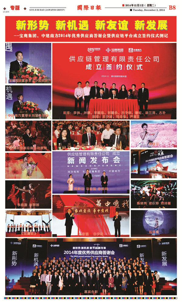 印尼《國(guó)際日?qǐng)?bào)》于12月2日B8版整版刊發(fā)了寶鷹集團(tuán)、中建南方2014年優(yōu)秀供應(yīng)商答謝會(huì)暨供應(yīng)鏈平臺(tái)成立簽約儀式盛況,現(xiàn)本網(wǎng)予以轉(zhuǎn)載。