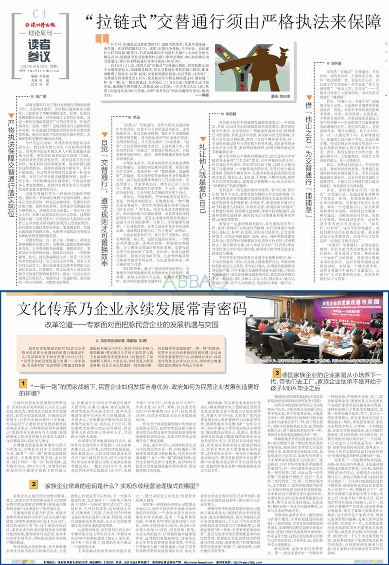 2015年10月20日,《深圳特區(qū)報(bào)》以《文化傳承乃企業(yè)永續(xù)發(fā)展長(zhǎng)青密碼》為題深度報(bào)道了10月14日于寶鷹集團(tuán)舉辦的“民營(yíng)企業(yè)的發(fā)展機(jī)遇與突圍,改革論道——專家面對(duì)面”交流會(huì),向社會(huì)大眾闡述了交流會(huì)上學(xué)者和企業(yè)家關(guān)于民營(yíng)企業(yè)發(fā)展和家族企業(yè)傳承的精彩觀點(diǎn)。