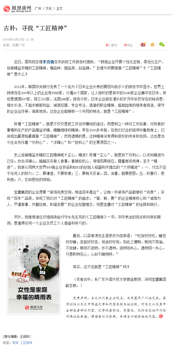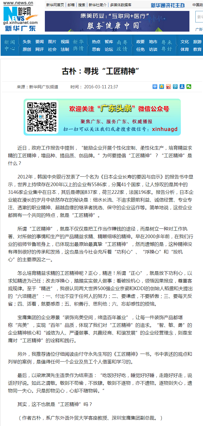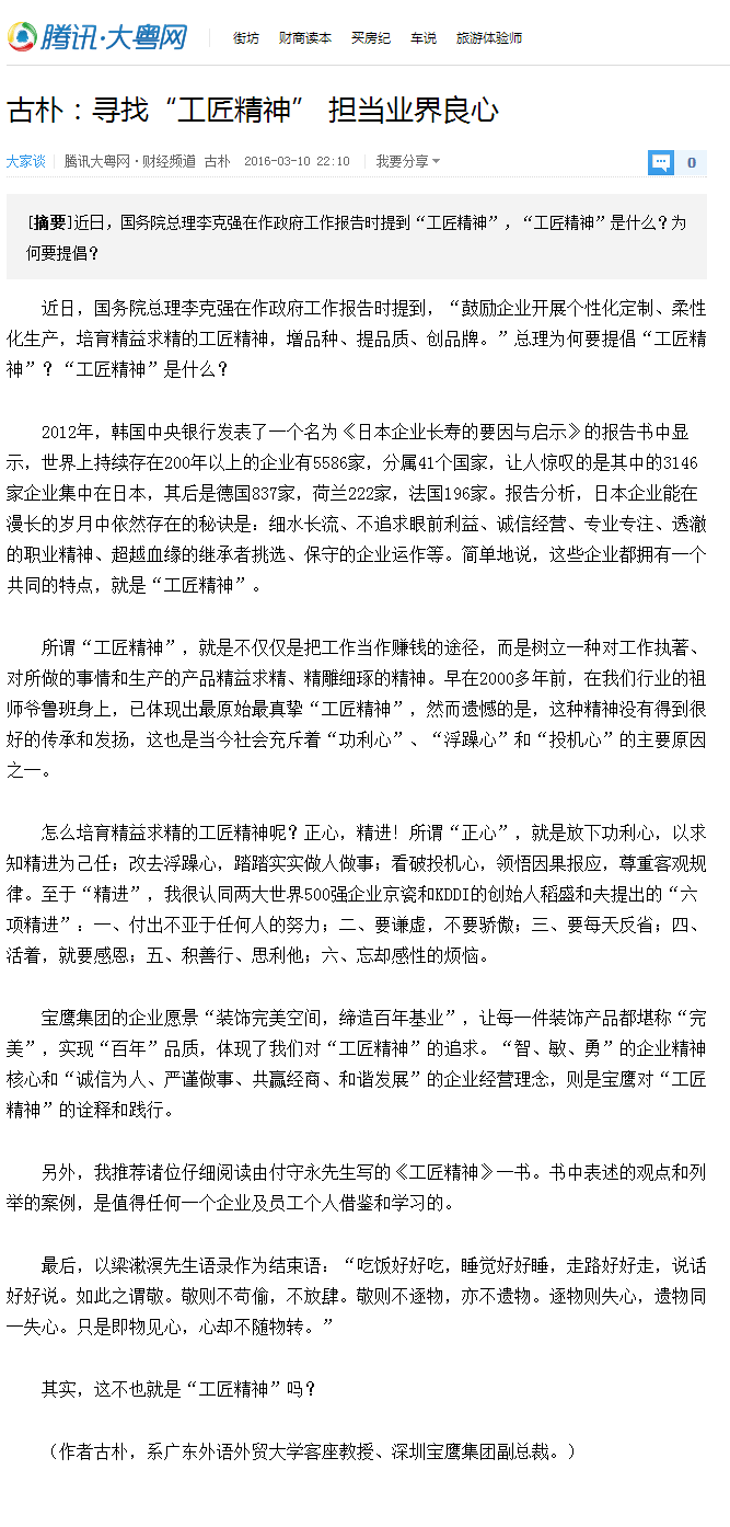 近日,國(guó)務(wù)院總理李克強(qiáng)在作政府工作報(bào)告時(shí)提到“工匠精神”,“工匠精神”是什么?為何要提倡?騰訊網(wǎng)、鳳凰網(wǎng)、新華網(wǎng)等國(guó)內(nèi)多家媒體刊登寶鷹集團(tuán)副總裁文章《尋找“工匠精神”》,且看古樸先生如何解讀。