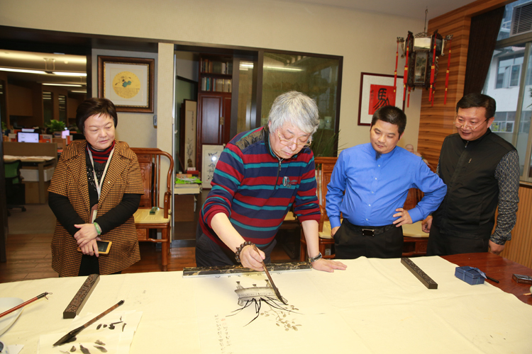 周國城主席揮毫寫蘭花(一)(右一為東莞旗峰山藝術(shù)館館長王躍慶先生,左一為寶鷹集團(tuán)監(jiān)事會主席胡蘭萍女士,右二為寶鷹集團(tuán)副總裁古樸先生)