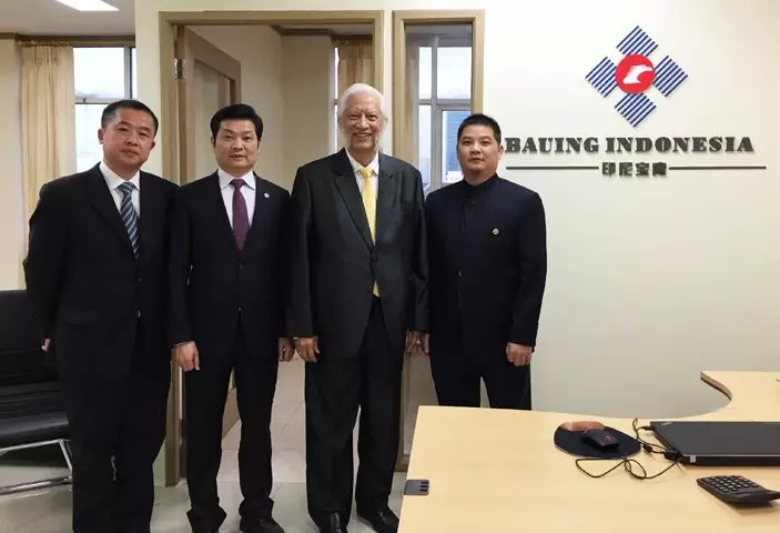 印尼熊氏集團(tuán)董事長(zhǎng)熊德龍(左三)、寶鷹集團(tuán)董事局主席古少明(左二)、副總裁古樸(右一)和印尼寶鷹總經(jīng)理陶武銘(左一)在印尼寶鷹辦公室