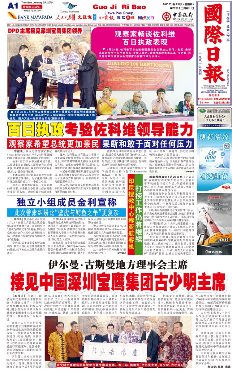 印尼《國(guó)際日?qǐng)?bào)》頭版頭條刊載古少明主席一行拜訪印尼地方代表理事會(huì)主席伊爾曼·古斯曼