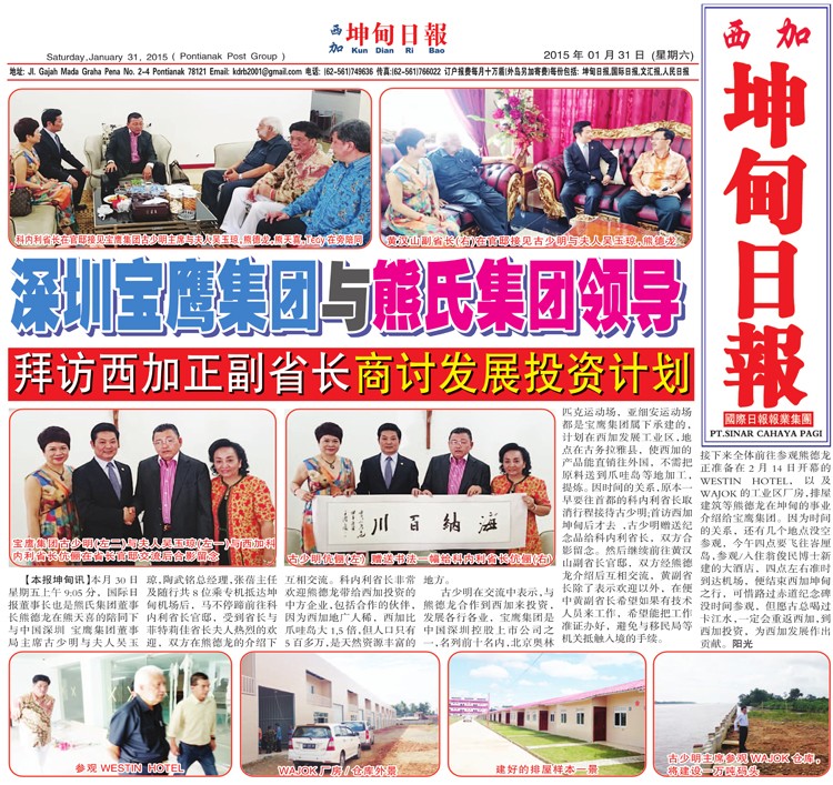 30日上午,古少明主席、夫人吳玉瓊女士一行與熊德龍董事長(zhǎng)抵達(dá)坤甸,受到了西加省長(zhǎng)科內(nèi)利、夫人菲特莉佳和副省長(zhǎng)黃漢山的親切接見(jiàn)。在古少明主席詳細(xì)介紹了寶鷹集團(tuán)概況后,省長(zhǎng)科內(nèi)利表示西加非常歡迎中方企業(yè)來(lái)西加投資,共同開(kāi)發(fā)西加豐富的天然資源及建設(shè)公共基礎(chǔ)設(shè)施。副省長(zhǎng)則提醒辦好工作準(zhǔn)證,避免與移民局等機(jī)關(guān)發(fā)生抵觸。一行人在坤甸還參觀了熊氏集團(tuán)旗下的Westin Hotel和Wajok的工業(yè)區(qū)廠房。