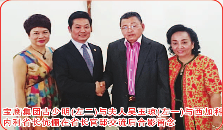 27日上午,古少明主席、古樸副總裁一行在印尼熊氏集團(tuán)董事長(zhǎng)熊德龍、印尼梅州會(huì)館會(huì)長(zhǎng)陳志明等人的陪同下,訪問(wèn)了印尼福建社團(tuán)總主席俞雨齡。訪問(wèn)中,俞雨齡主席表示:印尼新一屆政府重視招商引資,推出了一站式服務(wù),簡(jiǎn)化了投資手續(xù),大力發(fā)展基礎(chǔ)設(shè)施建設(shè),現(xiàn)在正是在印尼投資發(fā)展的好時(shí)機(jī)。俞雨齡主席還與古少明主席、古樸副總裁針對(duì)酒店的裝飾進(jìn)行了特別交流,希望他的四間豪華酒店能看到寶鷹精美的裝修,并期待寶鷹能在印尼大顯身手,為印尼的建設(shè)發(fā)展貢獻(xiàn)力量。