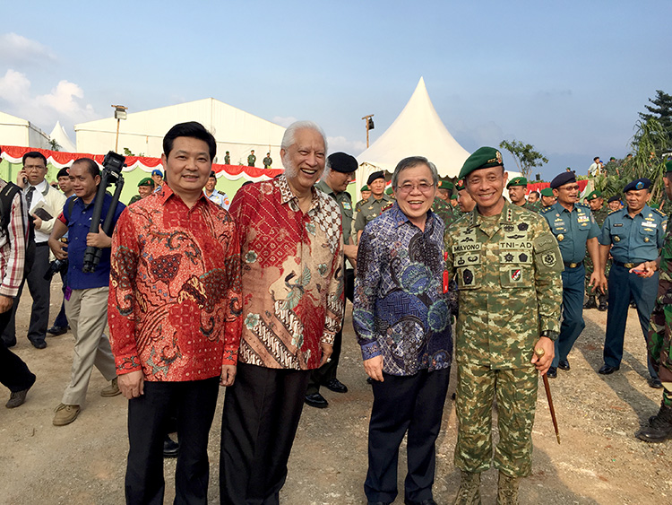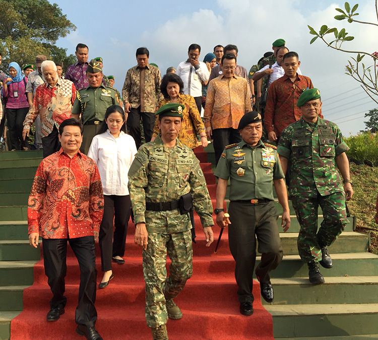 儀式結(jié)束后,佐科維總統(tǒng)在國(guó)軍總司令Moeldoko上將等陪同下離開會(huì)場(chǎng)(右起:陸軍總參謀長(zhǎng)Gabot上將、國(guó)軍總司令Moeldoko上將、印尼總統(tǒng)佐科維、政治安全統(tǒng)籌部長(zhǎng)Purdijatno、寶鷹集團(tuán)董事局主席古少明等)
