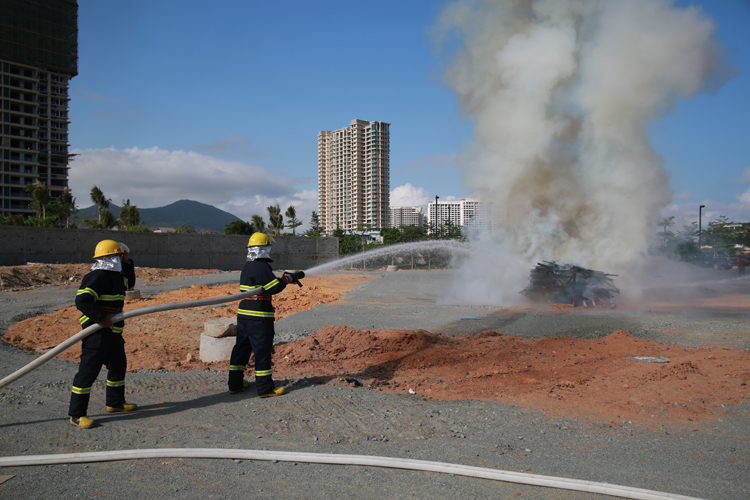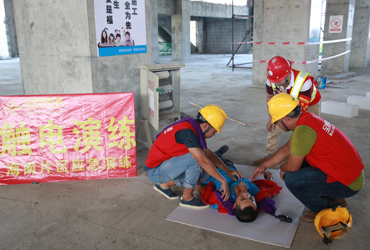 在綜合應急演練中,演練人員分別模擬了高空墜落、觸電、中暑、火災等工地常見的突發(fā)安全事件。在觸電事件發(fā)生后,演練人員按照正確的自救方法對傷員進行救治,迅速報告項目安全人員,并撥打120急救熱線,封鎖事件現(xiàn)場,待120專業(yè)救助人員前來救治。高空墜落、中暑和火災各演練亦遵循其各自的特點,在模擬實戰(zhàn)中為觀摩人員獻上豐富的一課。值得一提的是在滅火演練中,清水灣消防官兵不僅親自上陣為觀摩者示范消防設(shè)備的使用方法,還出動了消防車以增強演練的真實感。
