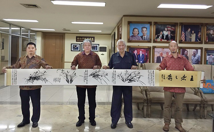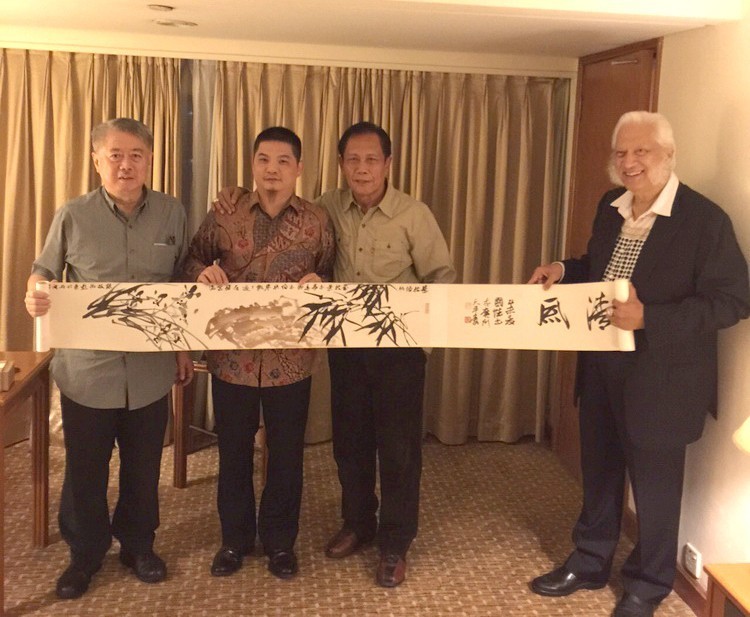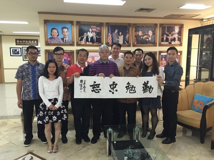 周國城主席為印尼寶鷹題字(右二為周國城主席,右一為古樸副總裁,右三為劉思東副主席)