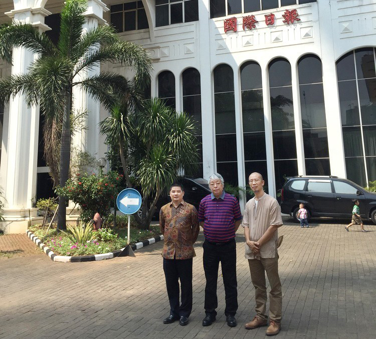 周國城主席(中)與古樸副總裁(左)、劉思東副主席(右)在印尼寶鷹總部——國際日報大樓前
