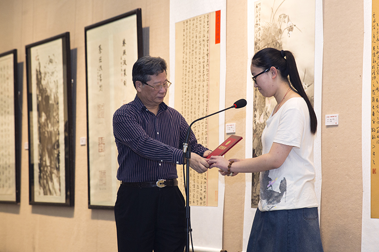 中國(guó)書法家協(xié)會(huì)行書委員會(huì)委員、中國(guó)書法家協(xié)會(huì)理事李遠(yuǎn)東為榮獲書法類一等獎(jiǎng)的林文頒獎(jiǎng)。