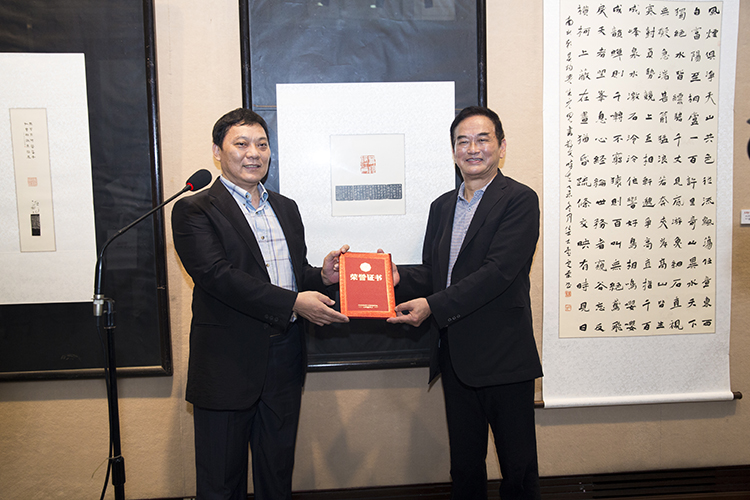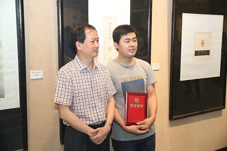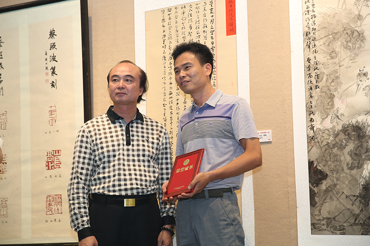 廣東廣播電視書畫院院長(zhǎng)、廣東省書法家協(xié)會(huì)副主席蔡照波為榮獲篆刻類二等獎(jiǎng)的朱小鵬頒獎(jiǎng)。