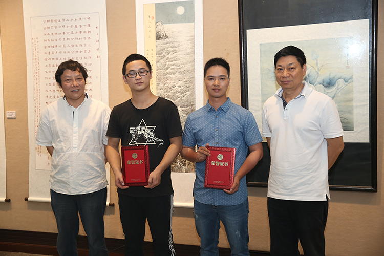 西泠印社社員、廣東華人書法院名譽(yù)院長(zhǎng)郭莽園先生,寶鷹集團(tuán)監(jiān)事會(huì)主席胡蘭萍與廣東廣播電視臺(tái)珠江頻道總編輯陳光文為榮獲國(guó)畫類三等獎(jiǎng)的黃詠茵、譚禮、黃毅成頒獎(jiǎng)。