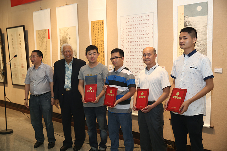 《國(guó)際日?qǐng)?bào)》董事長(zhǎng)熊德龍,國(guó)家文物進(jìn)出境責(zé)任鑒定員、廣東省文物鑒定委員會(huì)委員潘鳴皋,廣東省嶺南文化藝術(shù)促進(jìn)基金會(huì)書畫藝委會(huì)主任,廣州市藝術(shù)品行業(yè)商會(huì)常務(wù)副會(huì)長(zhǎng)兼書畫藝委會(huì)主任嚴(yán)君云,中國(guó)書法家協(xié)會(huì)香港分會(huì)執(zhí)行委員會(huì)副主席、《香港書畫報(bào)》總編輯、《香港書法》雜志主編范淳奇,廣東廣播電視臺(tái)珠江頻道總監(jiān)林建平為榮獲書法類三等獎(jiǎng)的張倩、何溉華、朱定榮、黎志源、曹端陽五位頒獎(jiǎng)。