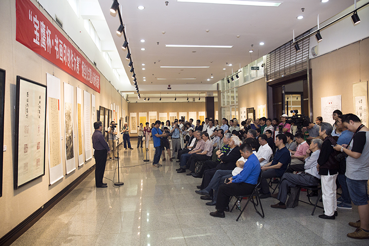 頒獎(jiǎng)禮由廣東廣播電視臺(tái)主持人伍燕主持。原廣東廣播電視總臺(tái)副臺(tái)長(zhǎng)、廣東廣播電視書畫院院長(zhǎng)、廣東省書法家協(xié)會(huì)副主席、西泠印社社員蔡照波代表主辦方致辭。他說,文化是民族的血脈,是社會(huì)大眾的精神家園,感謝大賽團(tuán)隊(duì)、評(píng)委團(tuán)隊(duì)的辛苦付出,感謝伙伴寶鷹集團(tuán)攜手共創(chuàng)盛事,祝賀各位獲獎(jiǎng)書畫印愛好者。這是一個(gè)文化大發(fā)展的時(shí)代,也 是實(shí)現(xiàn)夢(mèng)想的最好時(shí)代,書畫創(chuàng)作者應(yīng)致力于提升大眾審美品味,文藝創(chuàng)作應(yīng)最大限度的為大眾服務(wù)。