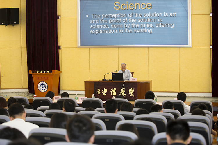 隨后,王兆凱院士開講《數(shù)學(xué)、科學(xué)、工程與工業(yè)創(chuàng)新》。講座中,王兆凱院士先通過對數(shù)學(xué)、科學(xué)、工程與工業(yè)的精確定義,并闡述各個學(xué)科之間關(guān)聯(lián),帶領(lǐng)大家回顧社會發(fā)展過程中各學(xué)科的相互推進,指出了部分學(xué)生在求知過程中的誤解。王兆凱院士認為:數(shù)學(xué)是可證的,并可用多種方式來進行求證;科學(xué)是客觀存在的,無需驗證但一直在改進,數(shù)學(xué)在社會發(fā)展到一定階段后才與科學(xué)產(chǎn)生了聯(lián)系;科學(xué)用于人工便是工程,工程匯聚形成工業(yè)。