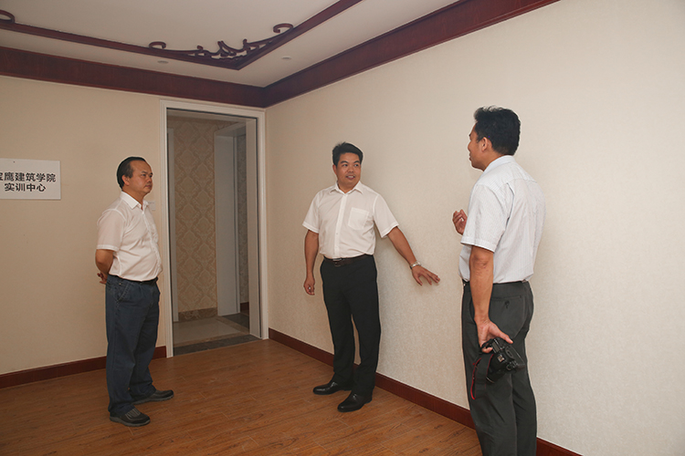 樓中樓是實訓中心的主體建筑,一層為裝飾實訓室,二層為居住空間粗裝和精裝展示室。古少波董事長認真觀察實訓中心“樓中樓”的每一個細節(jié),與劉延明院長及寶鷹建筑學院的老師、學生們一起探討施工工藝及實訓開展情況。