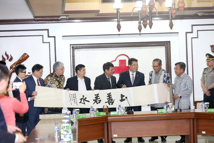 5月24日上午,在雅加達印尼紅十字會總部,寶鷹股份董事長古少波代表印尼寶鷹中國書畫邀請展中國組委會向印尼紅十字會捐贈了20億印尼盾善款。印尼副總統(tǒng)、印尼紅十字會總主席卡拉見證捐贈并發(fā)表致辭。