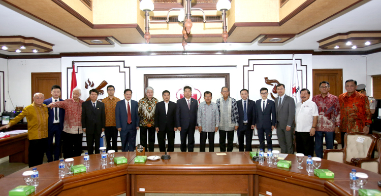 ▲合影(左二:董賓,左三:熊德龍,左四:蔡金城,左五:孫亮,左六:李大西,左七:周國城,左八:古樸,左九:古少波,右八:印尼副總統(tǒng)尤素夫·卡拉,右七:吉南加,右六:溫林樹,右五:吳義課,右四:潘逸航)